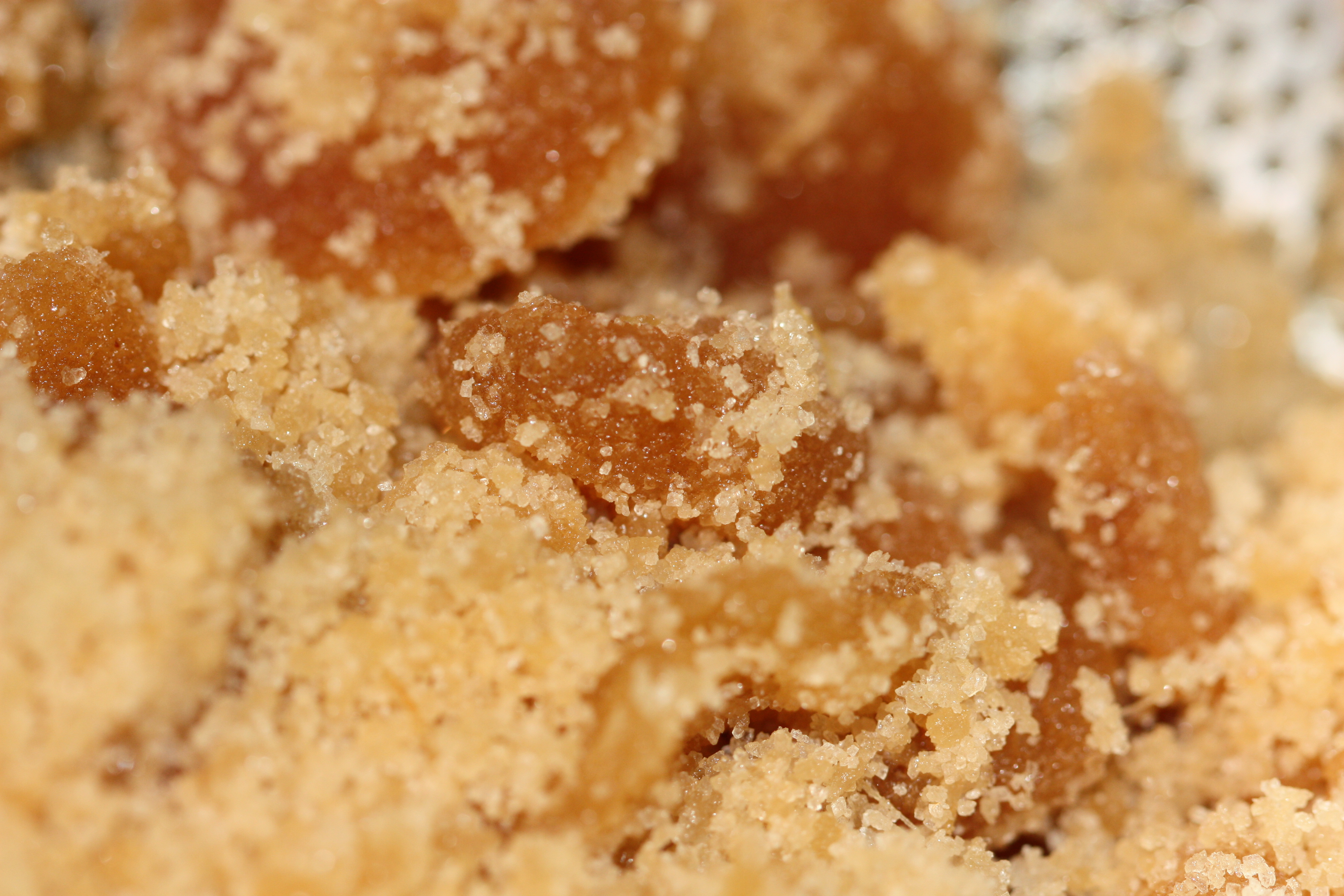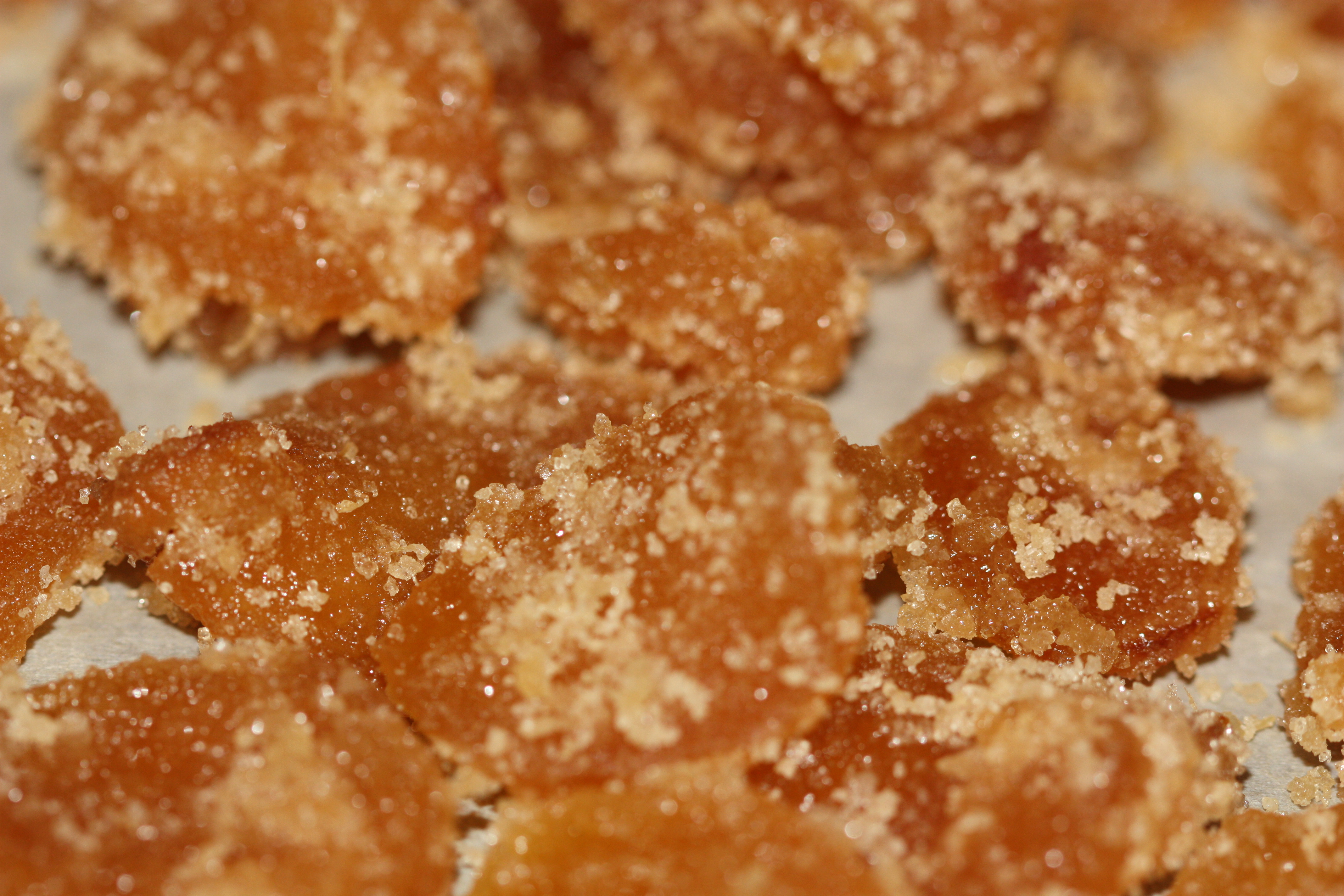 This year I followed the first recipe, but only boiled the ginger in water once. The ginger stayed very spicy. I also had to leave the house midpoint, so my husband took the boiling ginger off the burner and let it harden into a huge mass before I came back. It had been pretty much finished by this point, but on my return I had to re-liquify the whole thing before attempting to drain the ginger from the syrup. Not a lot of it drained. Mostly the “syrup” hardened and I placed the ginger pieces onto parchment paper carefully by hand (as it was still pretty hot). I didn’t bother putting the pieces into granulated sugar as the sugar already on the ginger pieces crystallized.