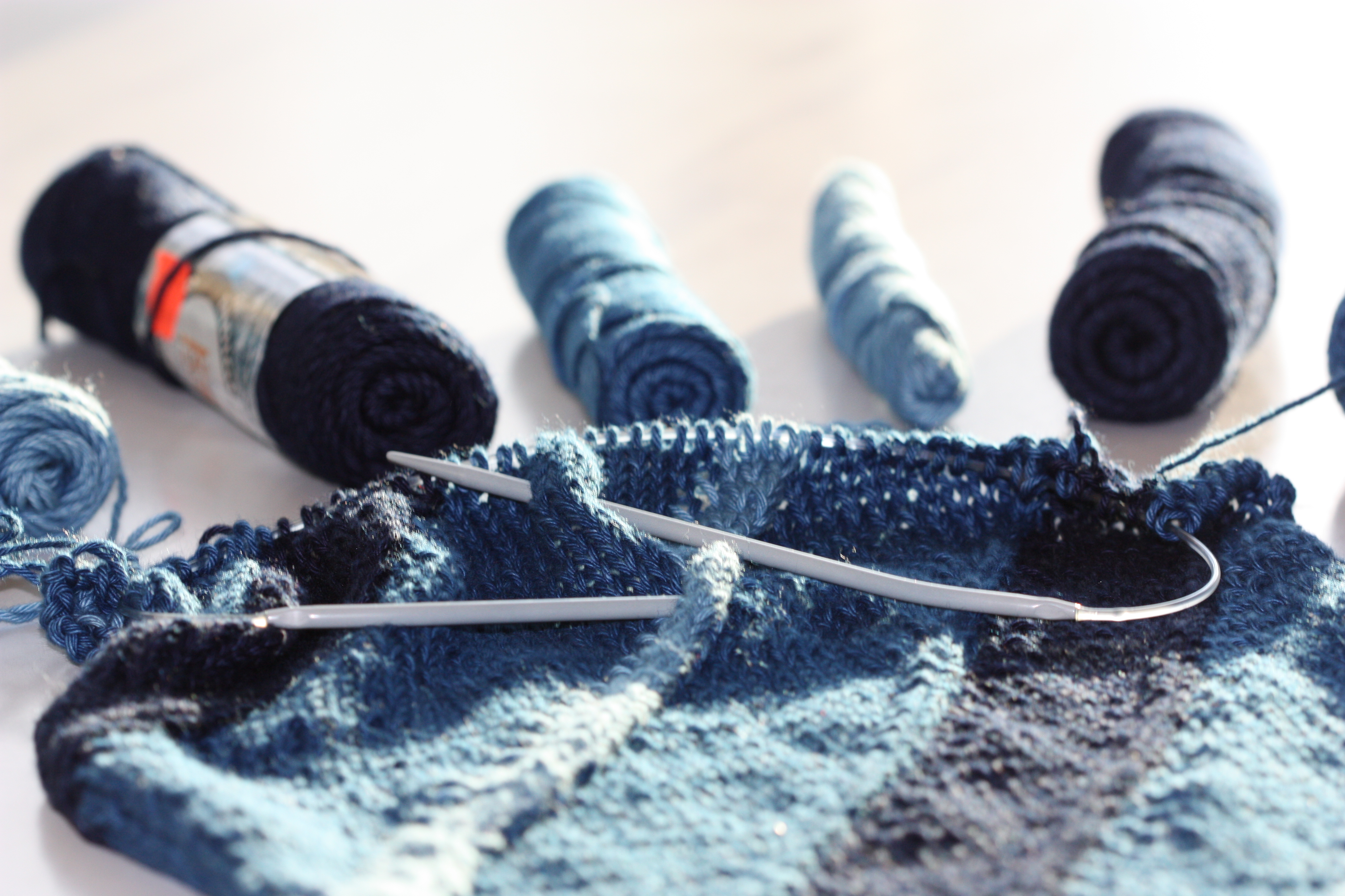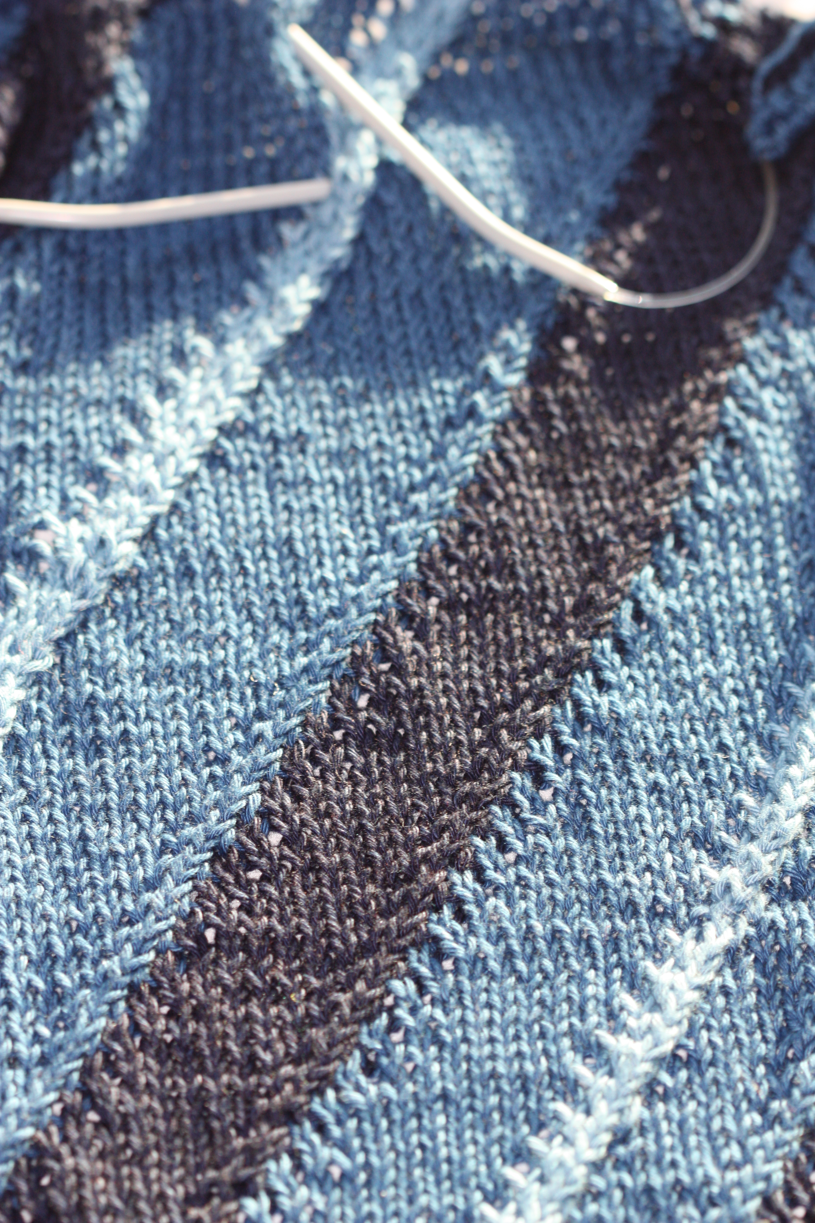 I knit (there was some cabling involved) the entire row in the following order 13 royal blue, 8 dark blue, 9 royal blue, 3 light blue, 9 royal blue, 9 dark blue, 6 royal blue. How I added cabling was through the first two stitches of almost all of the colour changes–just to make things a little more interesting. Then I continued the pattern and on the RS rows just offset each colour change by one, moving the diagonal stripe to the right. When I have time to figure out how to chart this I will. Not to make excuses (but I am totally going to) I am enrolled full-time in school, work one day a week and coach soccer for one of my kids. I’ve been a little busy.